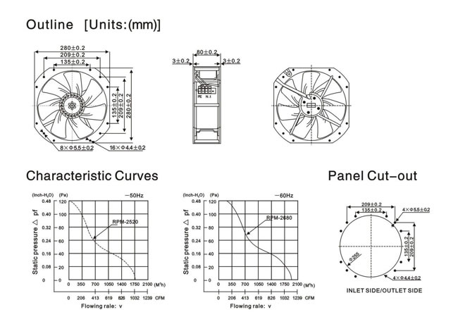 | Dimension (mm) | Model | Voltage (AC) | Frequency (Hz) | Current (AMP) | Power (Watts) | Speed (PRM) | Air Flow (CFM)/M3/min | Pressure (mmH2O) | Noise (dBA) | Weight (Gram) |