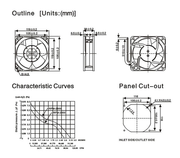 | 120x120x38 | PD120M-110 | 115 | 50 | 0.25 | 19 | 2500 | 94/2.70 | 62.7 | 49 | 595 |