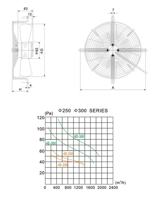 | Model | Voltage (V) | Frequency (Hz) | Current (A) | Input (W) | Speed (r/min) | Air volume (m3/h) | Noise (dBA) | Capacitor (μF) | Approx. weight (kg) | Size | ||