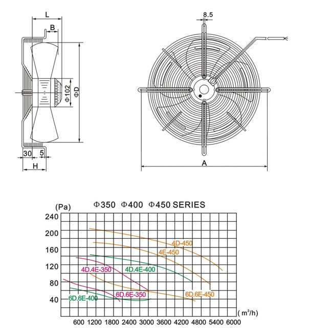 | Model | Voltage (V) | Frequency (Hz) | Current (A) | Input (W) | Speed (r/min) | Air volume (m3/h) | Noise (dBA) | Capacitor (μF) | Approx. weight (kg) | Size | ||||