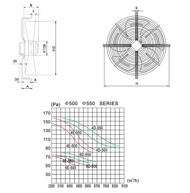| Model | Voltage (V) | Frequency (Hz) | Current (A) | Input (W) | Speed (r/min) | Air volume (m3/h) | Noise (dBA) | Capacitor (μF) | Approx. weight (kg) | Size | ||||