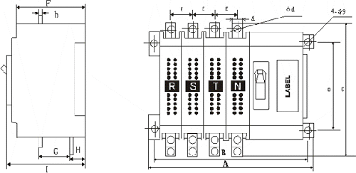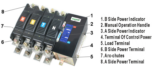 SA5 series automatic change over switch are composed of two parts: main contact system and control system. It is connected as an organic whole by the mechanical drive organization. The design is accurate and rational, electric and machinery are chained at the same time to guarantee the main power source and emergency power supply not to be linked at same time. The main contact adopts the silver tungsten alloy and silver carbon compound tungsten graphite which are able to bear the electric arc with strong ability to lengthen service life. Arc-chutes has strong quenching ability, and can realize the switch change over with load, it can also realize manual change over by handle 2 under no load. Adopting the electrodynamic electromagnetism drive and the direct current pulse operating, So it plays an important role on prolonging the coil life and saving the electric energy. Electric interval and creepage distance of the switch accord with the isolator standard, so it has isolated functions. A1,A2 and B1,B2 are the terminals of the two groups power control wire.The switch keeps 2 groups of auxiliary contacts (A1,A3,B1,B3) or 3 groups of auxiliary contacts (A3,A4,A5,B3,B4、B5) to serve the purpose of other at same time. |